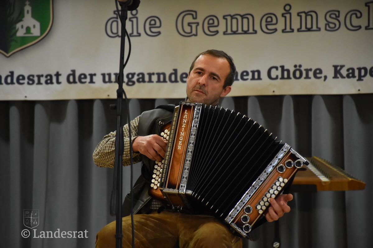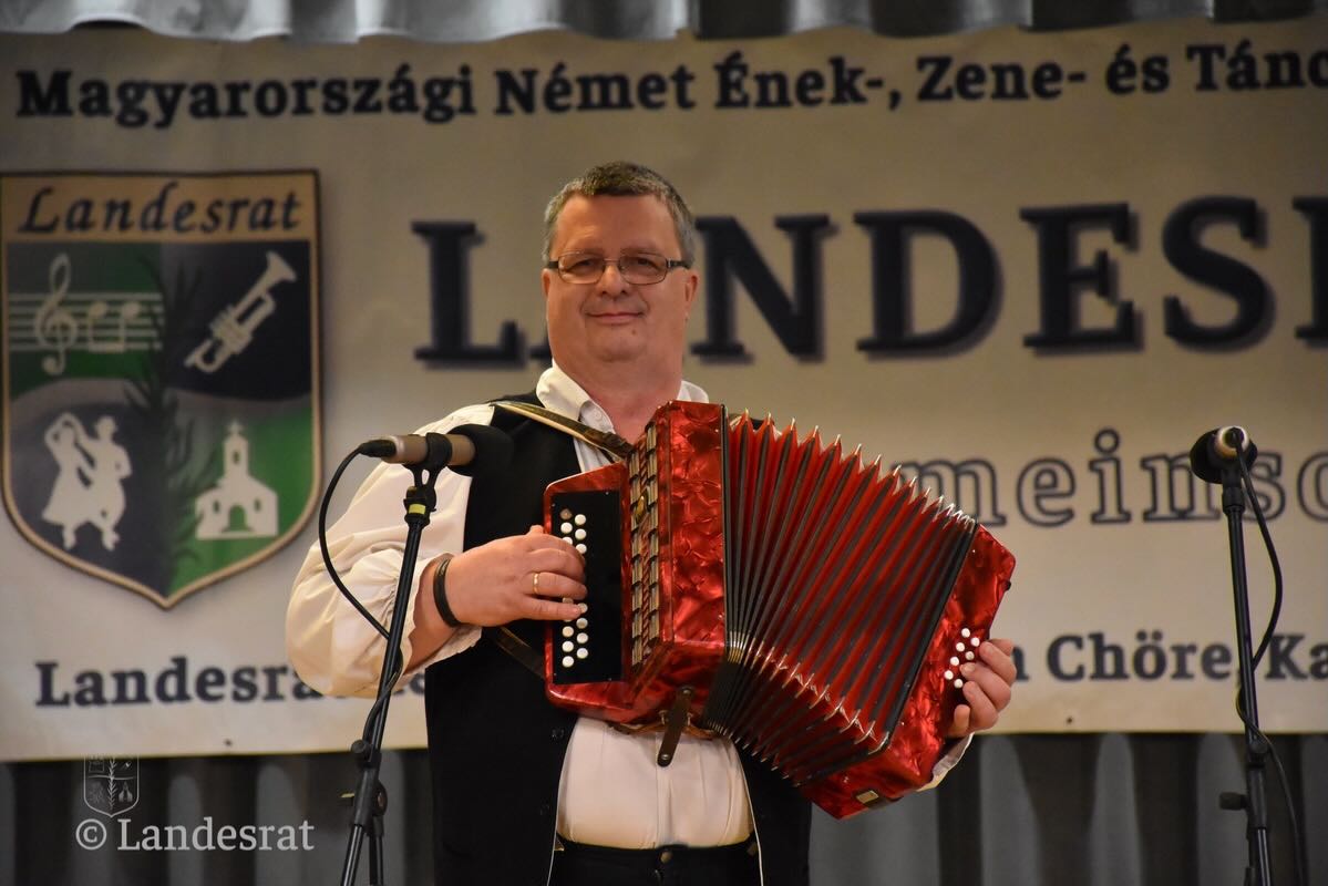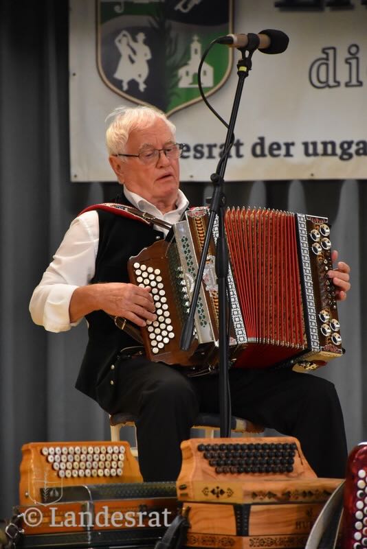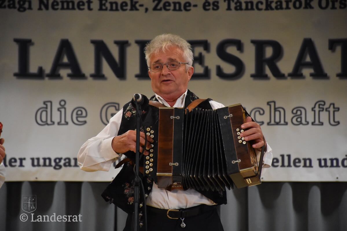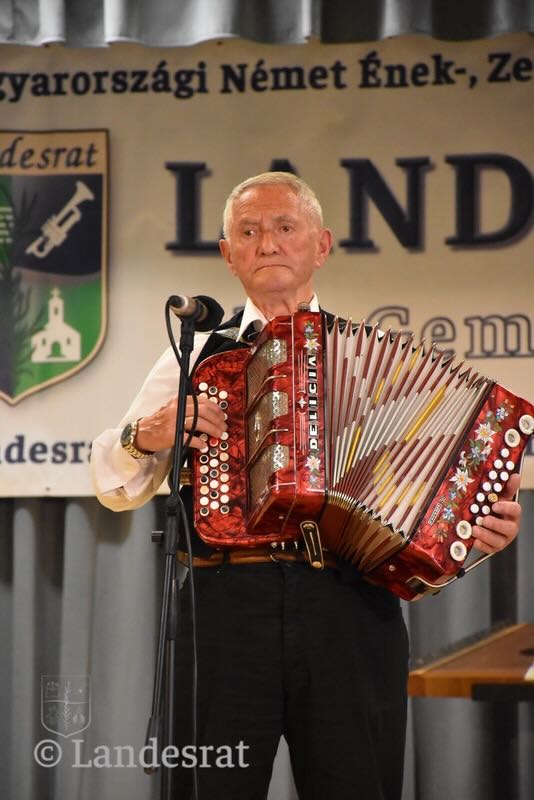 Dann betraten die Neulinge des Treffens, István Werb aus Nadasch und János Kéri aus Harast, mit ihren Knopfharmonikas die Bühne. István Werb, der Musiker der berühmten Nadascher „Stammtisch“-Kapelle, brachte Lieder aus seinem Heimatort mit. Das erste Mal mit dabei war auch János Kéri aus Harast, der ein lebendes Beispiel dafür ist, dass es nie zu spät ist, sich mit traditionellen schwäbischen Instrumenten, insbesondere dem Knopfharmonika, zu beschäftigen. Sein Kontakt zur deutschen Musik begann während seiner Bergwanderungen in Österreich und Deutschland. Er hörte gerne den Einheimischen zu, die in den Hütten und Gasthöfen Akkordeon spielten, und auf Anregung seiner Frau begann er vor knapp sechs Jahren, das Akkordeon spielen zu lernen und kaufte sich bald darauf eine Knopfharmonika. Er ist ein Autodidakt und hat seine Fähigkeiten in Kursen verfeinert. Vor zwei Jahren trat er dem Schorokscharer Männerchor bei, indem er als Sänger am Chorleben teilnimmt und seit einiger Zeit auch die Harmonikabegleitung übernahm. Wir heißen ihn im Kreis der traditionellen Instrumentalisten willkommen und hoffen, dass er ein ständiger Teilnehmer der Treffen wird.