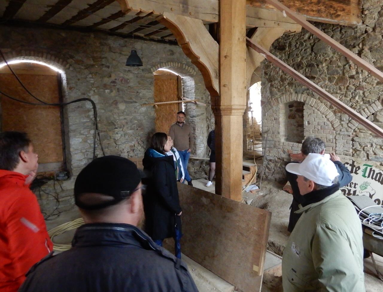 Nach dem Vortrag führte Michael Klein die Familie Schuth durch die Rauenthaler Kirche. Ein Aufstieg zum Glockenturm war wegen Bauarbeiten am Kirchendach leider nicht möglich – dafür gewährte die Baustelle des ehemaligen Rathauses interessante Einblicke. Dort wirkten einst Johann Heinrich Joseph Schuth (1754–1811), der Großvater und Johann Baptist Schuth (1832–1905), der ältere Bruder von Wilhelm und Vincenz, als Schultheiß.