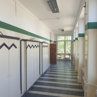 Im Rahmen der Maßnahme wurden das Kellergeschoss, das Erdgeschoss sowie die Räume im ersten und zweiten Obergeschoss frisch gestrichen, ebenso die Wandflächen des Haupt- und Nebentreppenhauses. Zunächst erhielten die Wände eine neue Spachtelung, anschließend wurden zur Überbrückung von Rissen Glasfasergewebe sowie Kantenschutzprofile eingebaut. Die Innenräume wurden in den bisherigen Farb- und Gestaltungsrichtungen erneuert, sodass der ursprüngliche Charakter der Schule gewahrt bleibt.