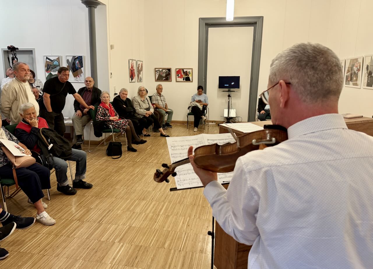 Das musikalische Programm von Zsuzsa Krausz-Hommer und Stefan Valentin machte die Vernissagezu einem besonderen Ereignis. Der Abend begann mit einem von Béla Bartók bearbeiteten ungarischen Volkslied, dem folgte das Stück Hüvelyk Matyi von Sándor Szokolay sowie der Toccatina“ von Kabalewski, dargeboten mit Violine, Gesang und Klavier.