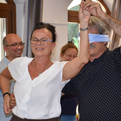 Am Nachmittag wurde die Erkundung der Region fortgesetzt, diesmal jedoch durch Tänze. Tanzlehrer und Choreograf László Nagy, ehemaliger Leiter des Maratzer Tanzensembles (1987-2023), Träger des Ferenc-Fülöp-Preises, und Ildikó Winhardt, Volkstanzlehrerin, Lehrerin für deutsches Nationalitätenfach, Kindertanzgruppenleiterin, Laiensammlerin und Forscherin, machten die Teilnehmer mit den Tänzen von Totwaschon bekannt. Danach brachte Barnabás Matuszek begleitet von Ádám Weisz auf dem Akkordeon ihnen Tänze aus Herend bei.