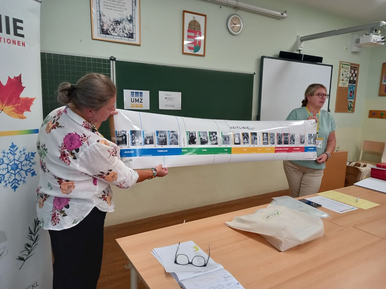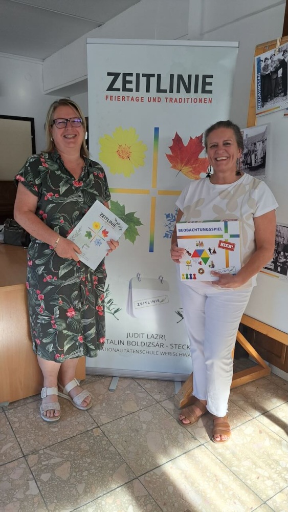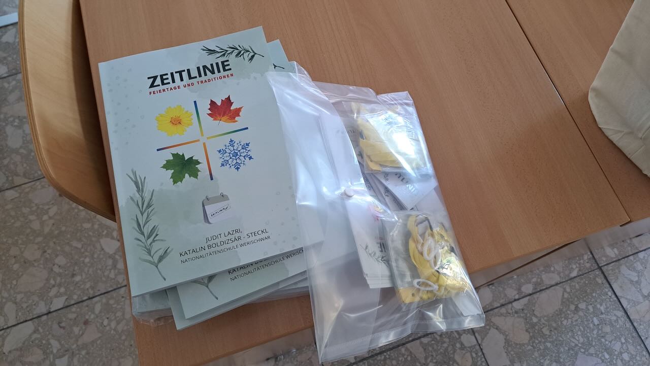 Im Mittelpunkt der Fortbildung stand die sogenannte „ZEITLINIE“, ein didaktisch durchdachtes Materialpaket, das Feste und Traditionen der deutschen Nationalität in Ungarn auf spielerische Weise vermittelt. Die TeilnehmerInnen – etwa zwanzig PädagogInnen aus verschiedenen Schulen pro Fortbildungsort – erhielten nicht nur theoretische Einblicke, sondern konnten die Materialien direkt vor Ort ausprobieren und eigene Ideen entwickeln. Am Ende der Fortbildung bekamen die teilnehmenden Schulen je ein Geschenkpaket.