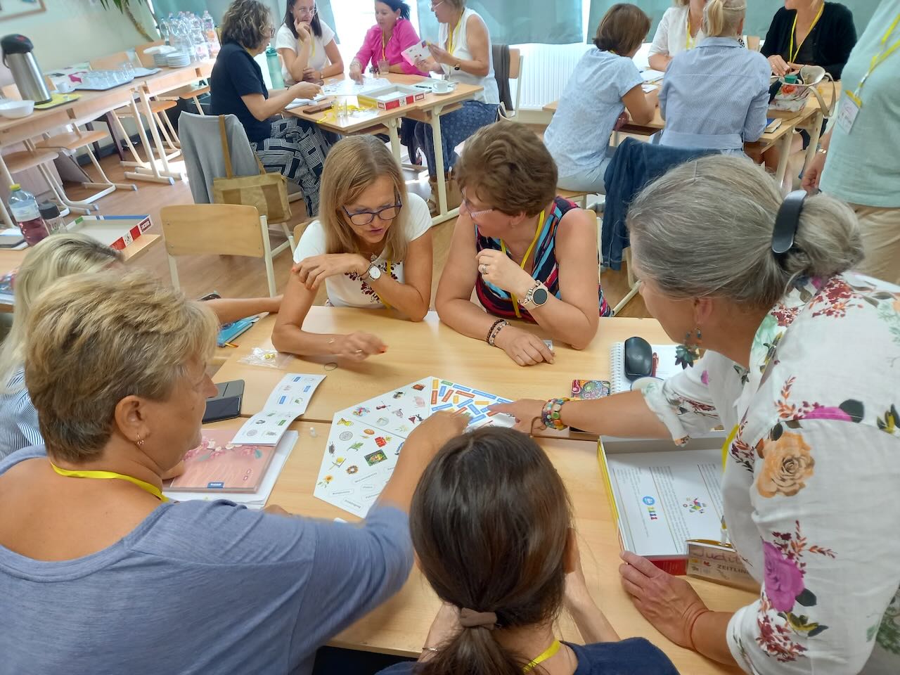 Zu Beginn des jeweiligen Workshops erhielten die Teilnehmenden eine Einführung in das ZEITLINIE-Projekt, wobei die Entstehung, die Ziele und die didaktischen Prinzipien des Lehrpakets vorgestellt wurden. Anschließend konnten sie die ZEITLINIE durch verschiedene Spiele, mit denen Feste und Traditionen der deutschen Nationalität vermittelt werden, erleben. In der dritten Einheit stand der handlungsorientierte Unterricht im Fokus, bei dem die Sprachförderung durch Bewegung und differenzierte Materialien für verschiedene Altersgruppen eine besondere Priorität bekommt. Die vierte Einheit widmete sich der Frage, wie Motivation und Nachhaltigkeit im Unterricht erreicht werden können. Hier wurden Beispiele für Wiederholungs- und Vertiefungsphasen sowie Mini-Unterrichtseinheiten präsentiert. Zum Abschluss hatten die Teilnehmenden die Möglichkeit, die Materialien im Detail kennenzulernen, eigene Ideen einzubringen und ein direktes Feedback zur Fortbildung zu geben.