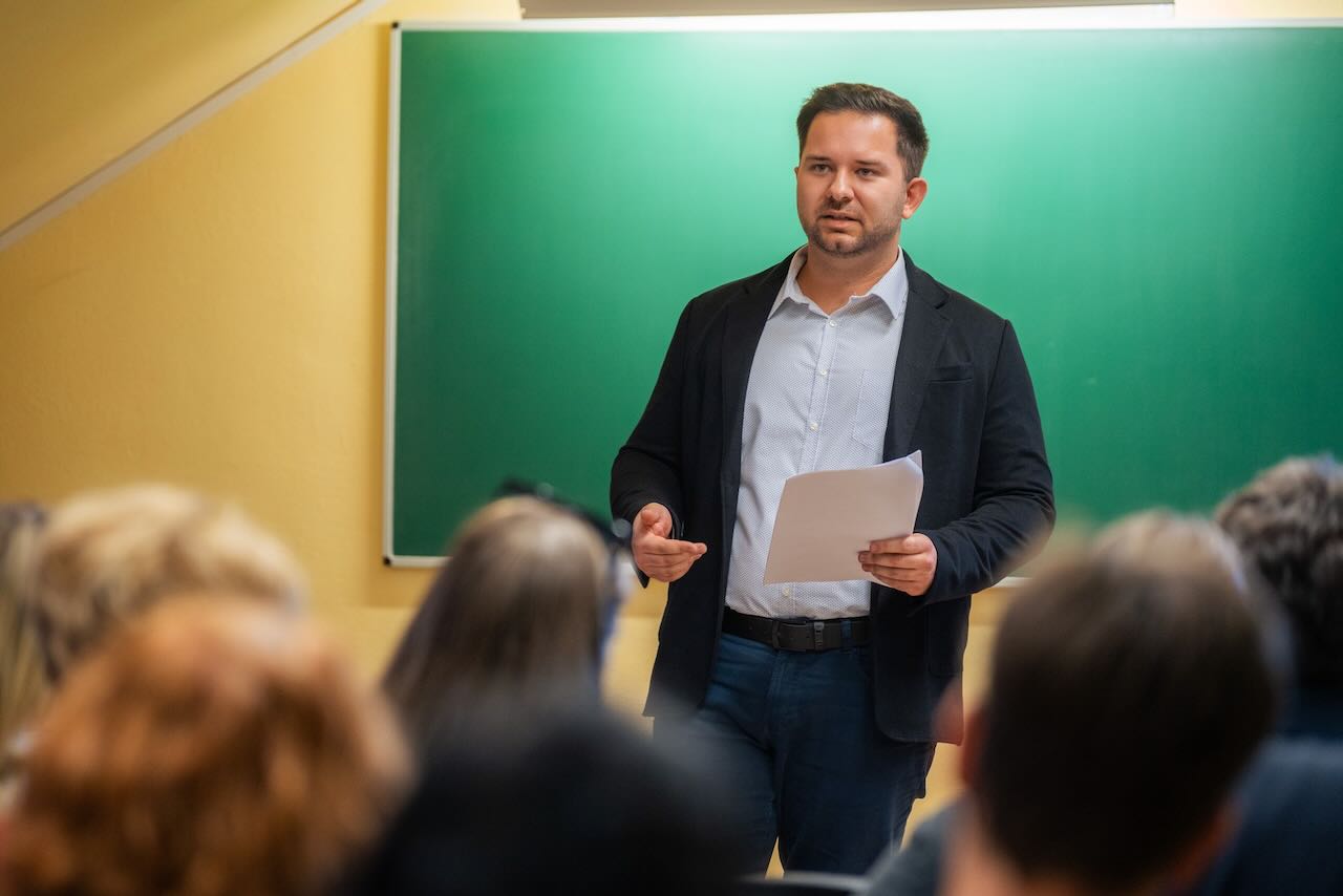Bei der offiziellen Eröffnung der Konferenz begrüßten wir unsere Gäste, darauf folgte ein Vortrag von Zoltán Macsek über die Rolle und Besonderheiten des Deutschunterrichts im ungarischen Bildungssystem zwischen den beiden Weltkriegen.