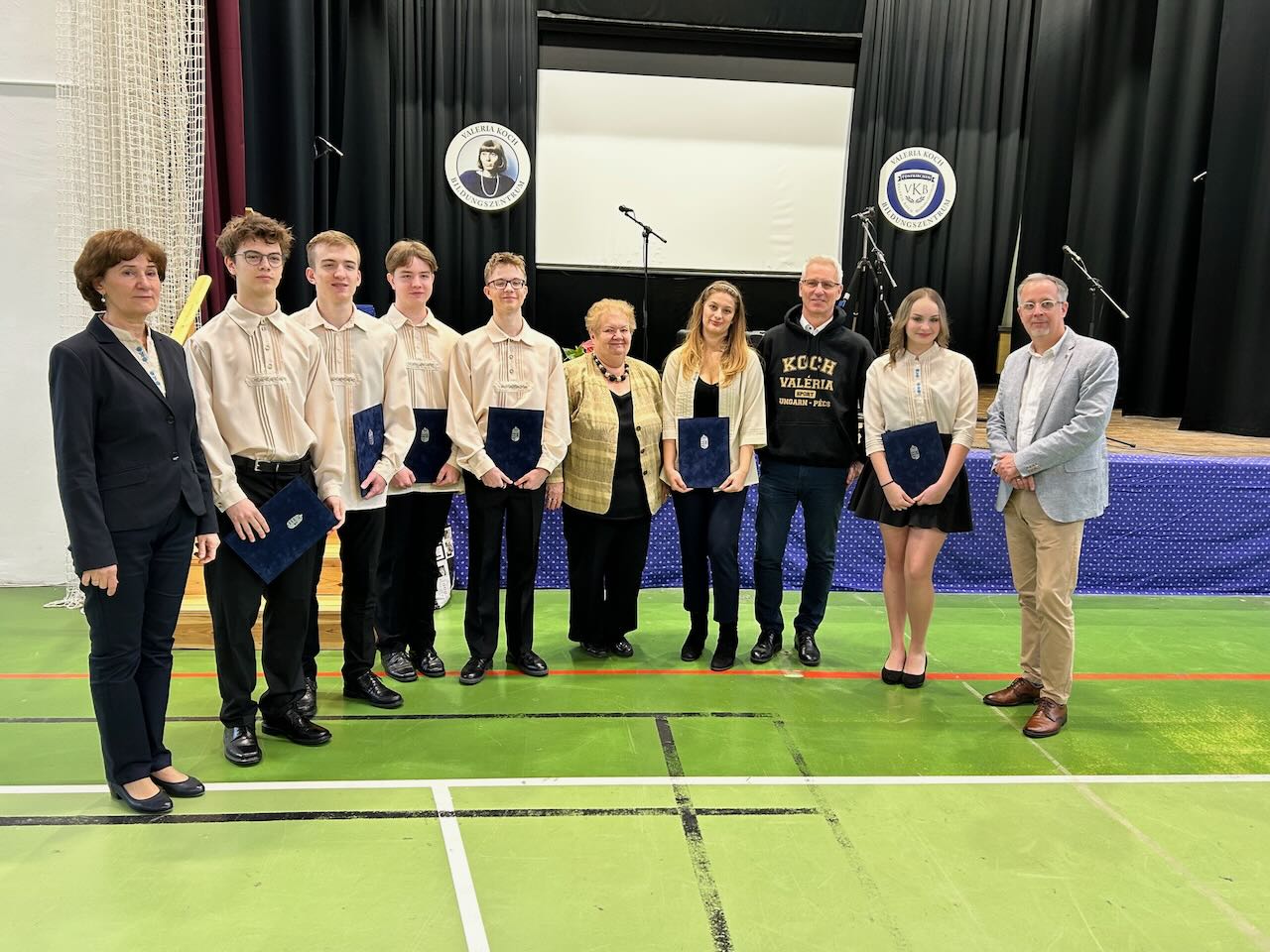 Im Anschluss an die Übergabe der renovierten Sporthalle fand die feierliche Verleihung der Nationalitätenstipendien statt. Ziel des vom zuständigen Staatssekretariat ausgeschriebenen Stipendienprogramms ist die Unterstützung von Nationalitätenschülerinnen und -schülern mit hervorragenden schulischen Leistungen sowie aktivem Engagement im Gemeinschaftsleben. In diesem Jahr wurden zehn ungarndeutsche Jugendliche ausgezeichnet, die das Gymnasium in Fünfkirchen absolvieren. Vom Klara-Leőwey-Gymnasium erhielten Zsófia Bak, Gerda Kamilla Mintál, Regina Mogyorósi und Réka Napsugár Pohl ein Stipendium. Das Valeria-Koch- Bildungszentrum wurde durch Nikoletta Erika Anta, Richard Heil, Péter Jászberényi, Marcell Schmidt, Marcell Takács und Léna Virth unter den Preisträgerinnen und Preisträgern vertreten.