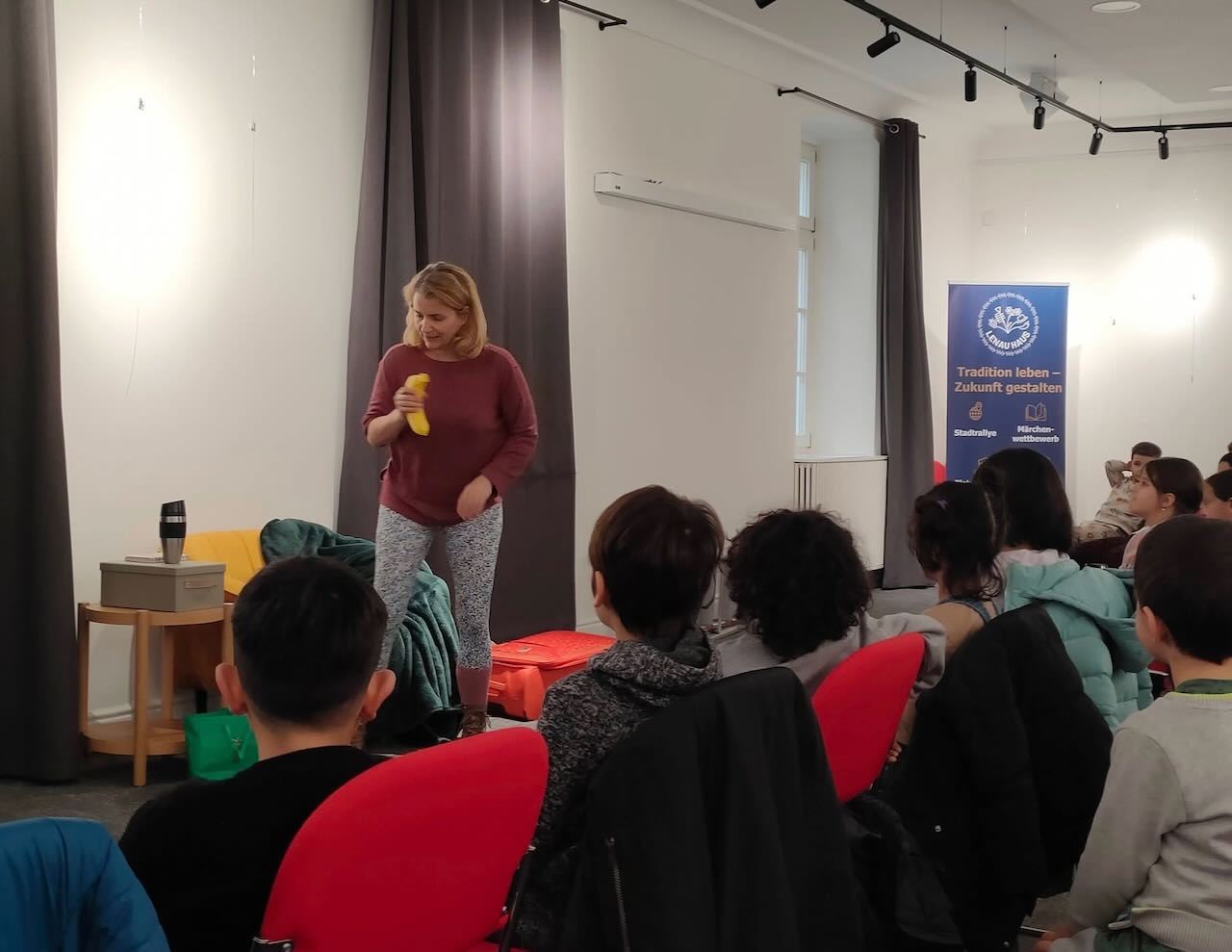 In Budapest stellte Krisztina Tóth (Álomzug Társulás) mit ihrem Koffertheater „Die Abenteuer der sieben Schwaben” vor. In der Geschichte wurden die sieben Schwaben samt ihren traditionellen Berufen und Vorlieben in witziger Form präsentiert. Sie flogen auf ihren Besen rund um die Welt und erlebten dabei zahlreiche Abenteuer. Die zweisprachige Vorstellung faszinierte sowohl die Kinder als auch die Erwachsenen. In der nachfolgenden Bastelstunde konnten die Kinder ihrer Kreativität freien Lauf lassen. Die wunderschönen Weihnachtsdekorationen wurden mit Freude und Stolz angefertigt und später den Eltern überreicht.
