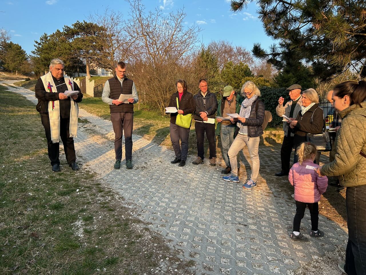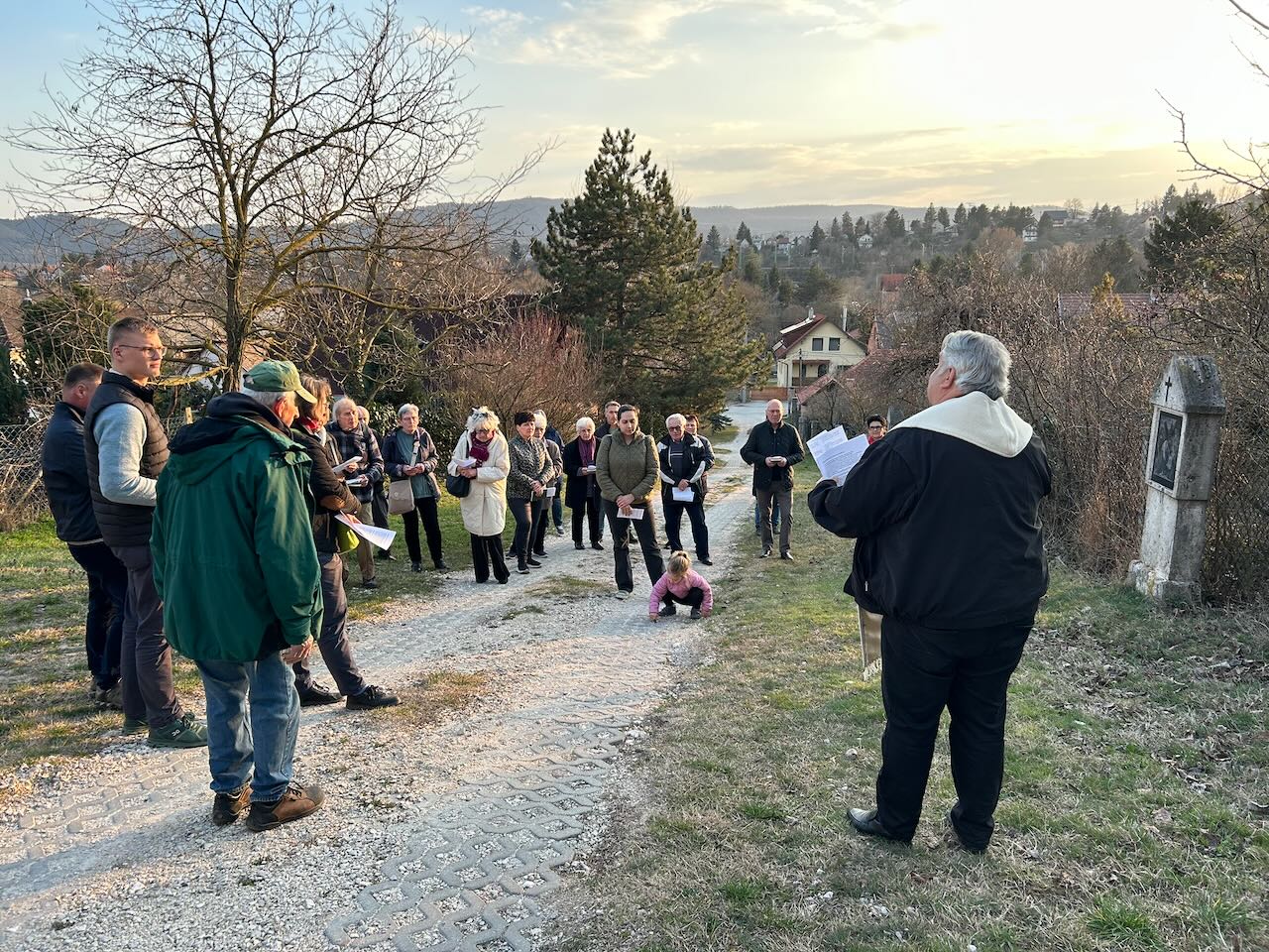 Die ca. 25 bis 30 Gläubigen aus verschiedenen Ortschaften, aber vor allem aus Budapest und Werischwar versammelten sich im Sonnenschein um 16:30 Uhr am Fuße des Kalvarienberges und gingen von dort singend und betend von Station zu Station.