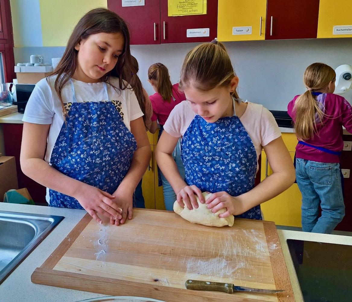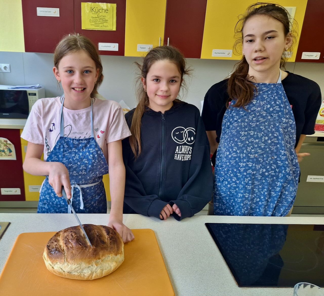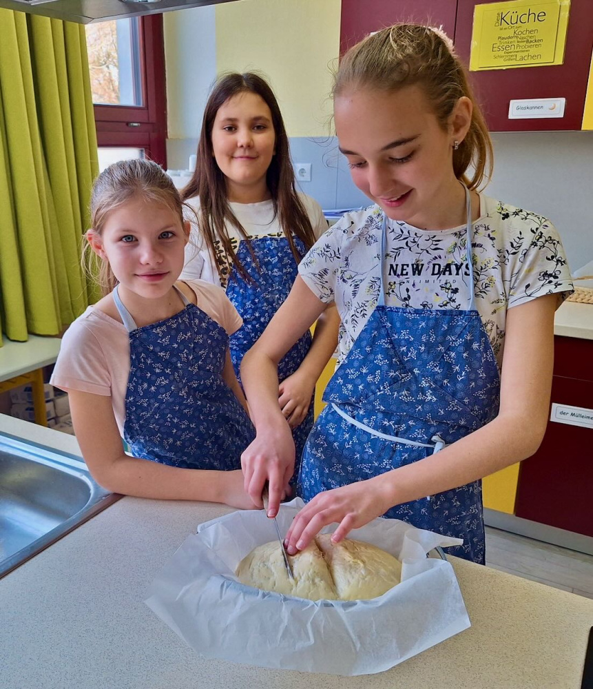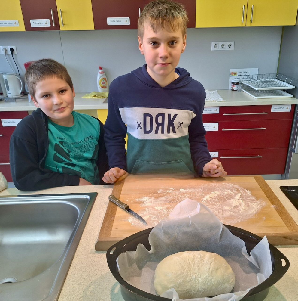 Dieses Thema inspirierte unsere Küchenfee-AG gleich. Die Kinder wurden zu Bäcker und backten Brot nach altem Rezept, aber schon im Elektroherd. Sie lernten dabei, dass man vor dem Aufschneiden drei Kreuze auf dem unteren Teil des Brotes macht. Dann das frische Brotgeruch zog sich durch die Schule… In der Deutschstunde lasen sie Wilhelm Knabels Gedicht „Zur Heimat zieht der Brotgeruch”, und lernten über Leckereien früherer Zeiten, die man anstatt Schokolade und Chips gegessen hatte um den Hunger zwischendurch zu stillen, wie zum Beispiel das „Zuckerport” oder „Peckmesprot”.