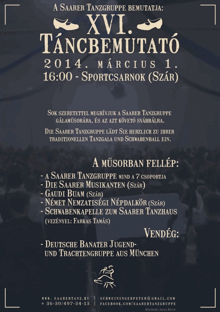 A táncműsor végén bemutatják a Szári lakodalmas című zenés-táncos darabot, melyet Schweininger Péter, a Saarer Tanzgruppe vezetője írt és rendezett. Ezt követi a svábbál, ahol a Gaudi Buam fog a jó hangulatról gondoskodni.