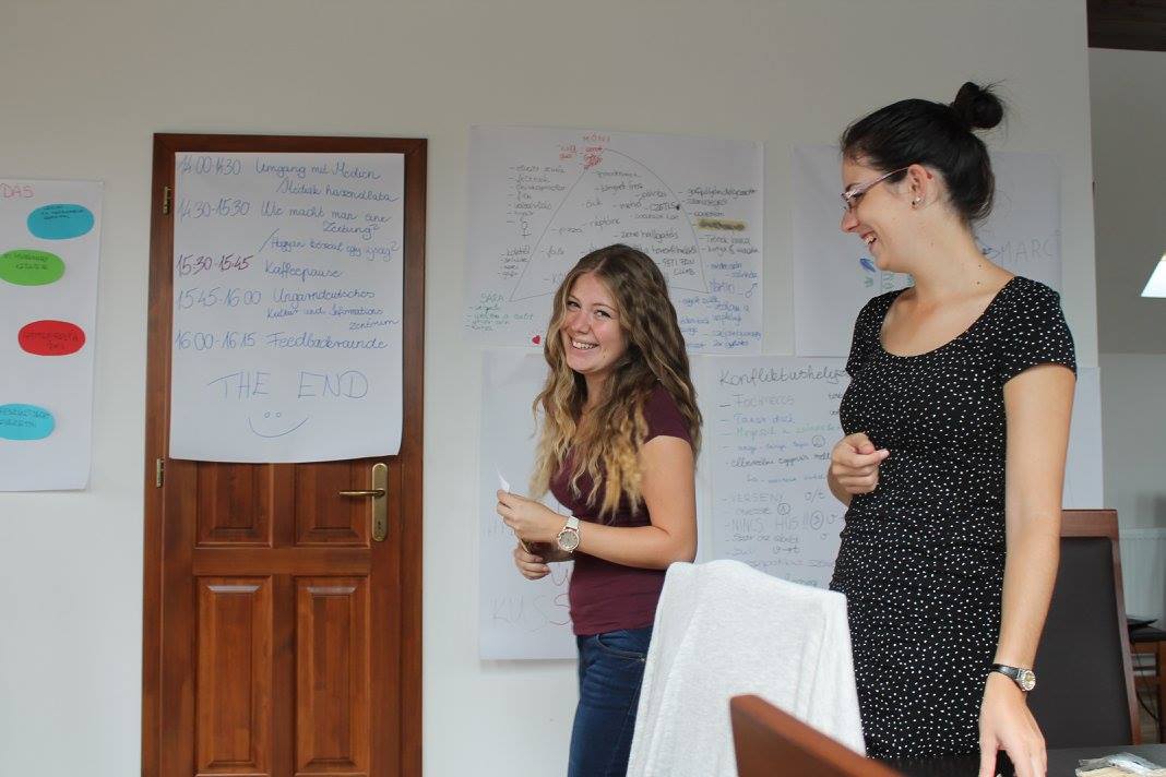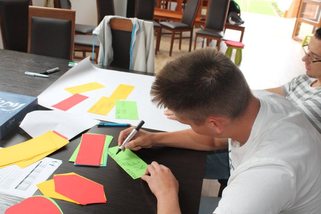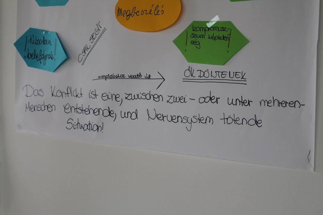 A napot a projekt bemutatásával kezdtem, ezután a részvevőkre hárult a nagyobb rész. Az első program az ismerkedős játékok voltak. Ezek meg is mutatták, hogy egy régi ismeretség még nem jelenti azt, hogy mindent tudunk a másikról. A bemelegítő feladatok jó hangulatot teremtettek a legnehezebbnek vélt témának: a konfliktuskezelésnek. A fiúk-lányok mégis nagy örömüket lelték benne. Megismerték a készségeiket és megismerkedtek a moderációs kártyákkal valamint a flipchartpapírokkal.