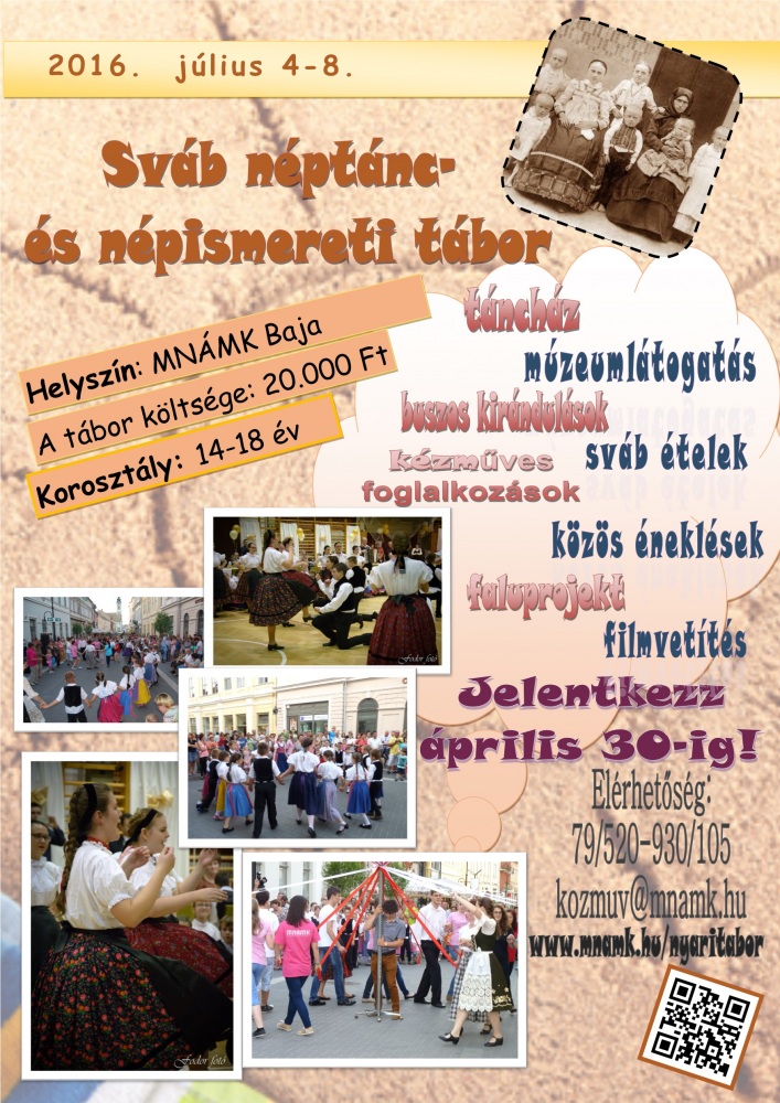 A bajai Magyarországi Németek Általános Művelődési Központja és a Bács-Kiskun Megyei Német Önkormányzat 2016. júliusában sváb néptánc- és népismereti tábort szervez.