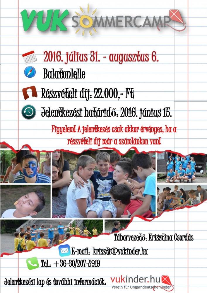 Az Egyesület a Magyarországi Német Gyerekekért 2016. július 31. és augusztus 6. között nyári tábort szervez Balatonlellén. A jelentkezési határidő június 15.