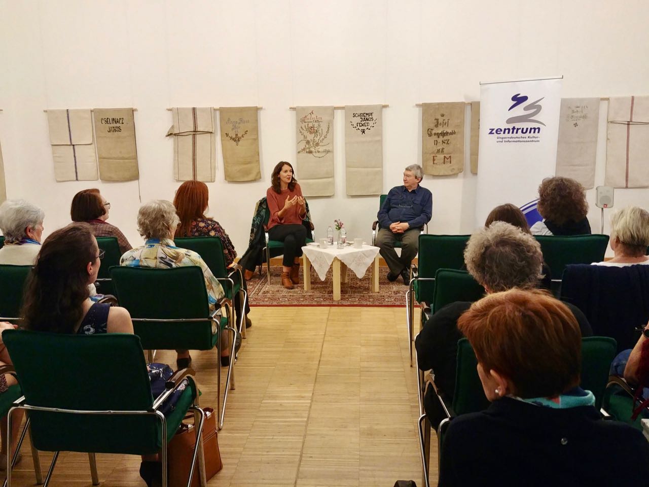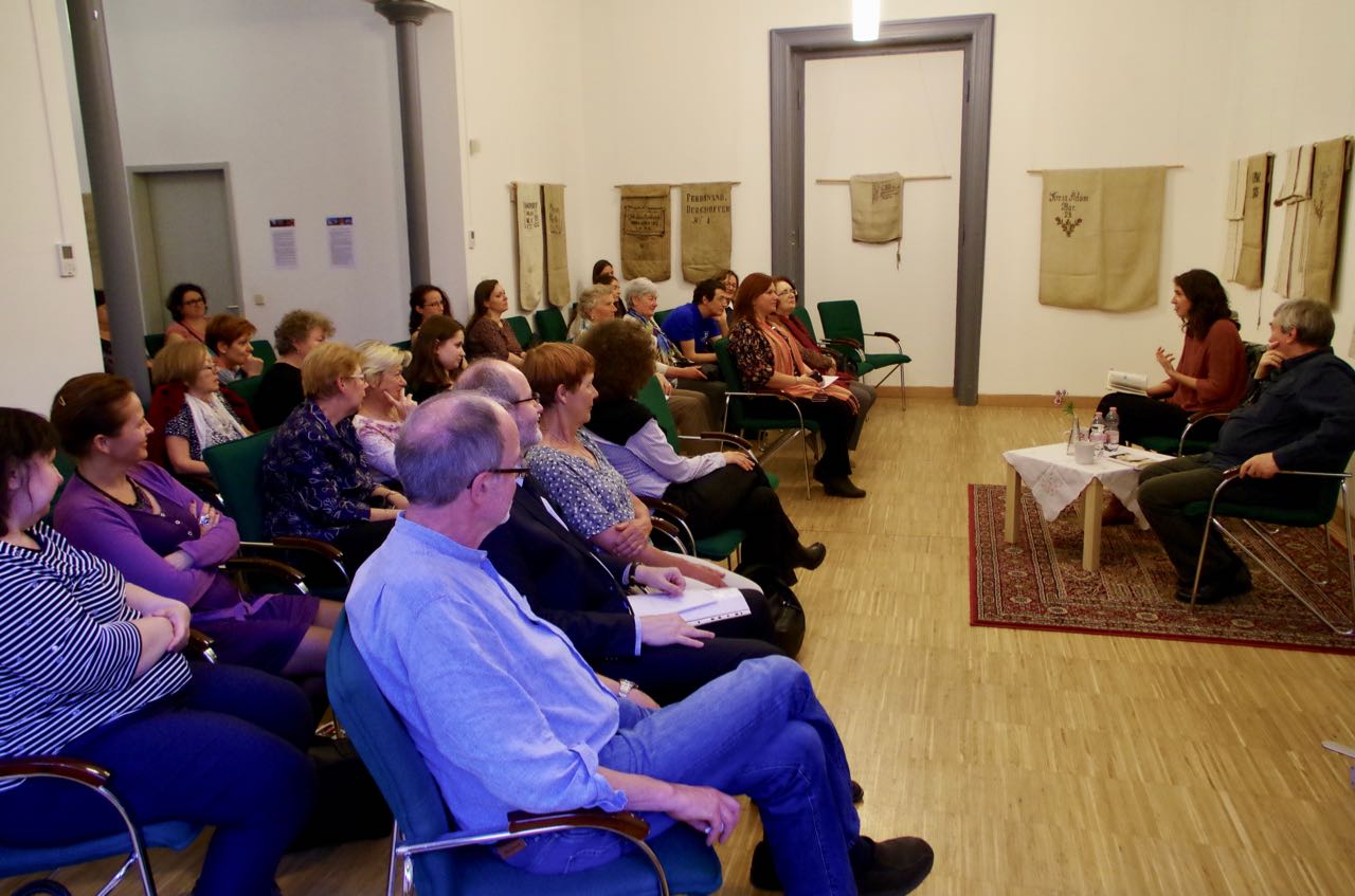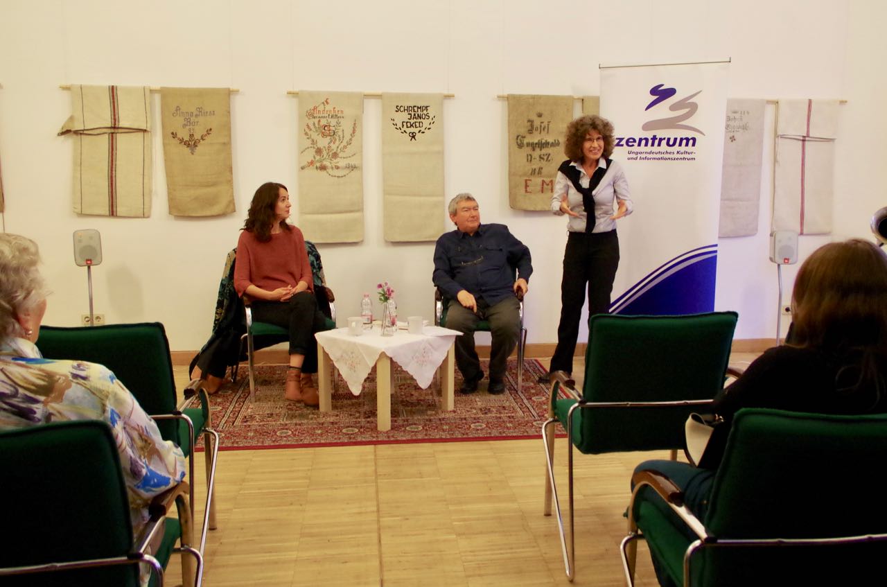 Dr. Ingeborg Szöllösi (a potsdami Német Kultúrfórum Kelet-Európa munkatársa) a a budapesti felolvasóest ötletgazdája, örömét fejezte ki, hogy újra itt lehet a Magyarországi Németek Házában. Továbbá kiemelte, hogy egy olyan jó együttműködés, mint amit Ambach Mónika, a Zentrum igazgatónője és Schuth János, a Magyarországi Német Írók és Művészek Szövetsége 1. elnöke részéről tapasztal, manapság egyáltalán nem magától értetődő. A dicsérő szavakat követően az írónővel Schuth János beszélgetett, aki első emlékeit is felidézte 1974-ből, melyek az Erdélyben levő Nagyszebenben érték az ottani oktatást jó színvonalát illetően. Romániában már akkoriban is voltak német, illetve magyar egynyelvű iskolák.