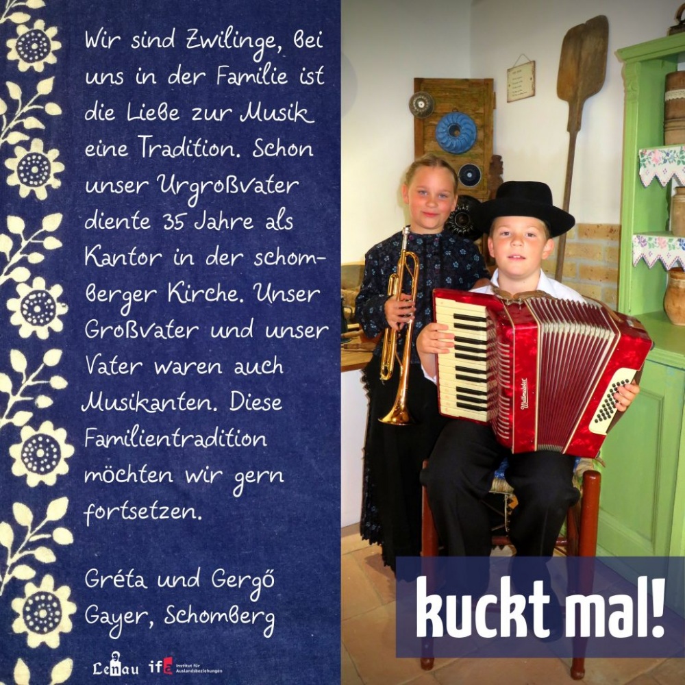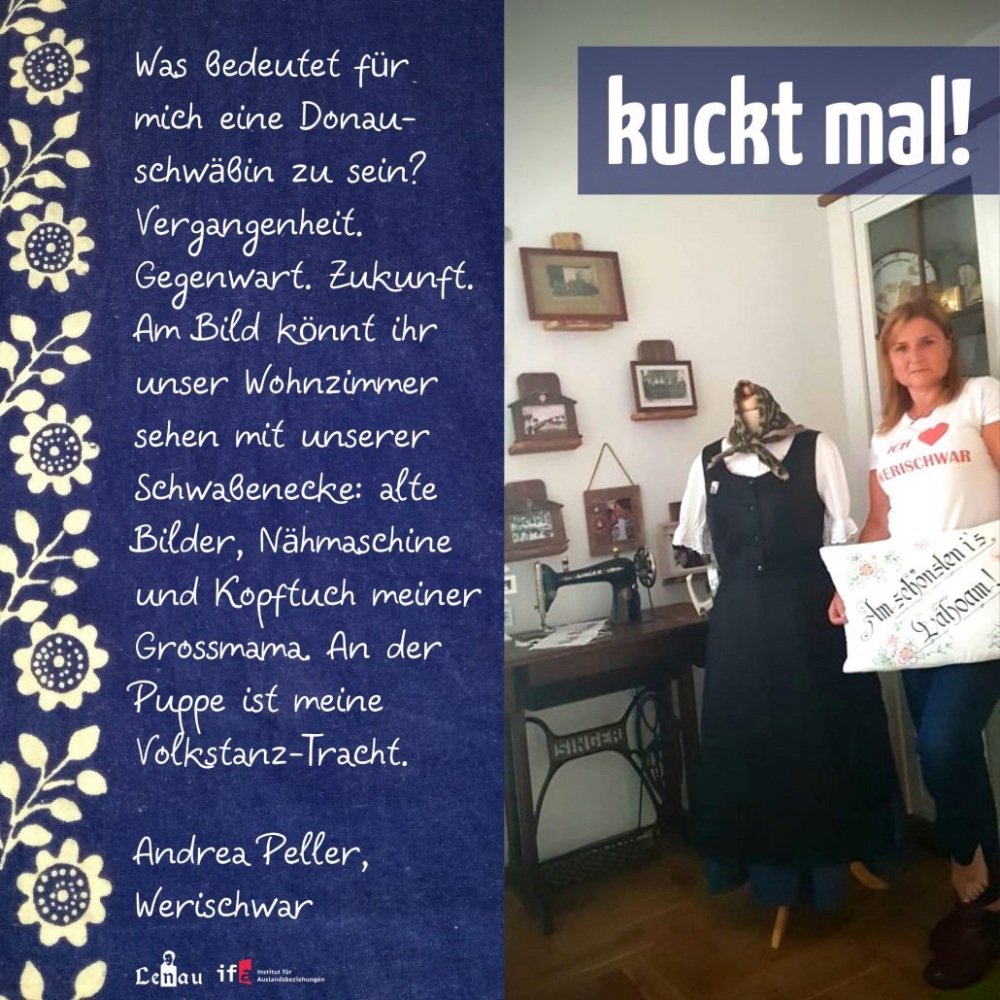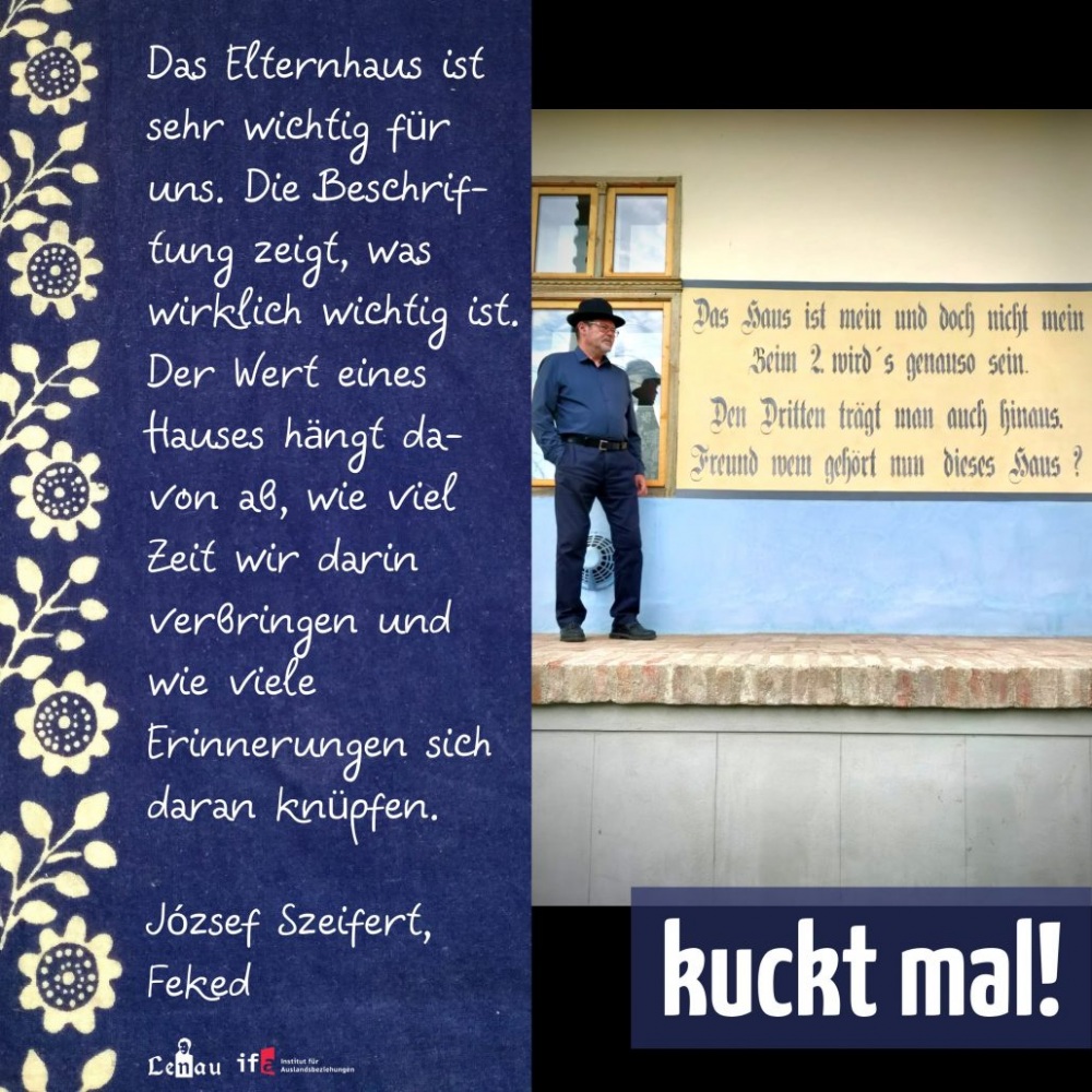 A kuckt mal! sorozatban a pécsi Lenau Ház és a németországi Nemzetközi Kulturális Kapcsolatok Intézete (fia) szeretnének olyan tárgyakat és hozzájuk kapcsolódó személyes történeteket bemutatni, amelyek nagyszülőkről gyermekekre, unokákra szálltak, így örökítve tovább a magyarországi németek hagyományait.