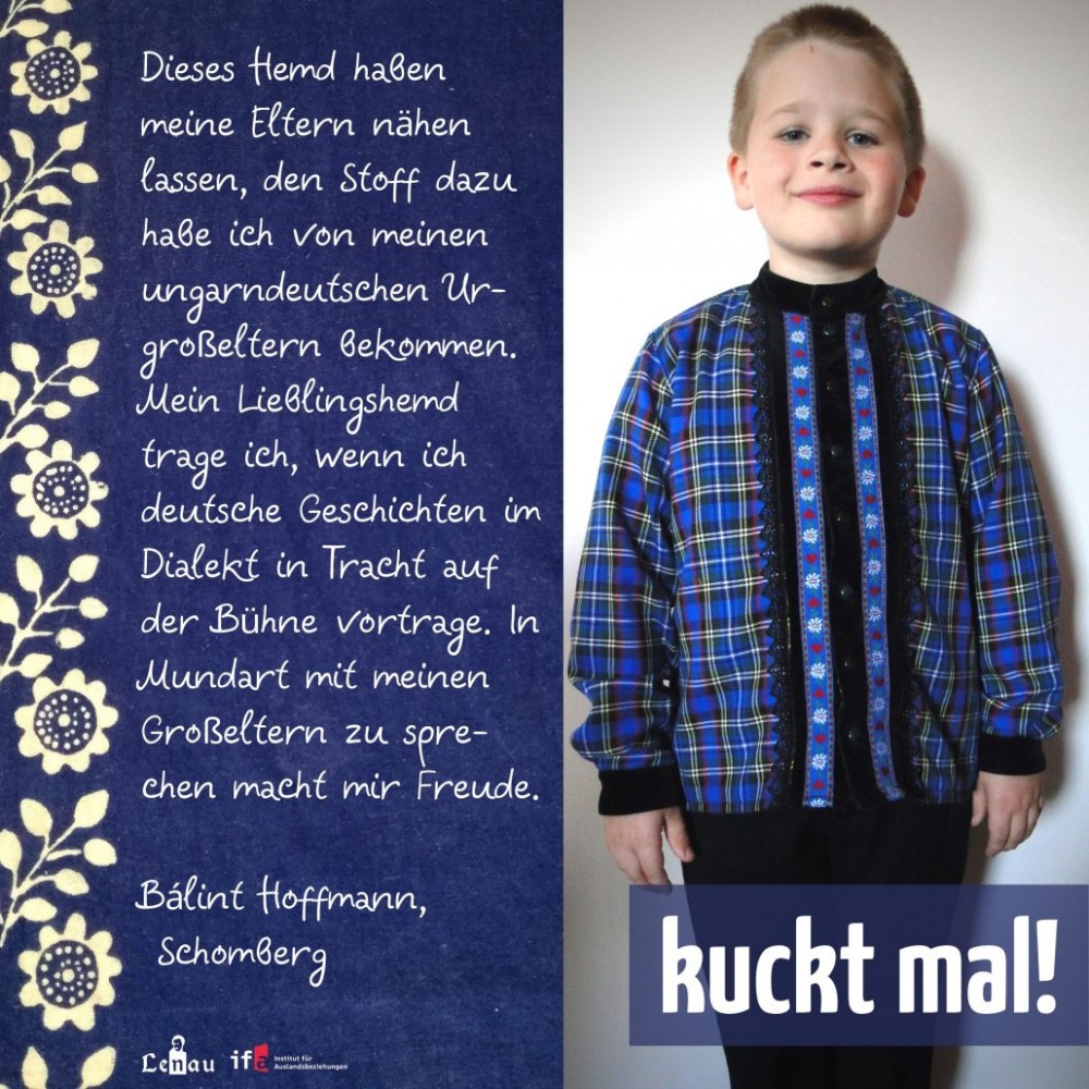 Ezt az inget a szüleim varratták, az anyagát pedig a magyarországi német dédszüleimtől kaptam. A kedvenc ingemet akkor hordom, amikor német történeteket mesélek nyelvjárásban, népviseletben a színpadon. Nagyon szeretek német nyelvjárásban beszélni a nagyszüleimmel.