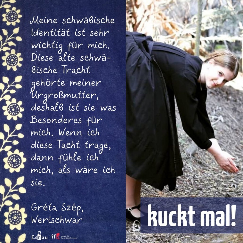 A sváb identitásom nagyon fontos számomra. Ez a régi népviselet a dédnagymamámé volt, ezért nagyon különleges számomra. Ha ezt a ruhát hordom, úgy érzem, mintha én ő lennék.
