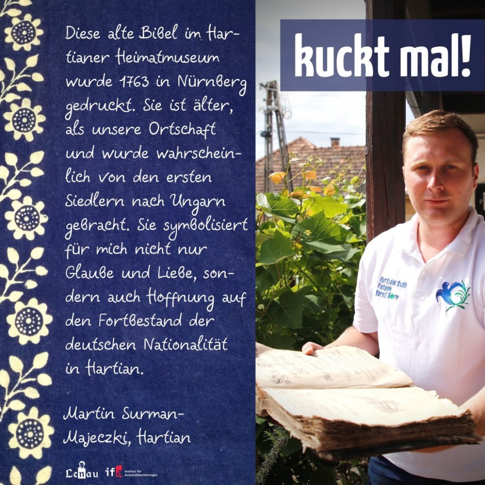 Ezt az Újhartyáni Sváb Tájházban található régi Bibliát 1763-ben nyomtatták Nürnbergben. Régebbi, mint a helységünk, valószínűleg az első német telepesek hozták magukkal Magyarországra. Ez a Biblia számomra nem csak a hitet és a szeretetet szimbolizálja, hanem a reményt is, hogy a német nemzetiség fenn fog maradni Újhartyánban.