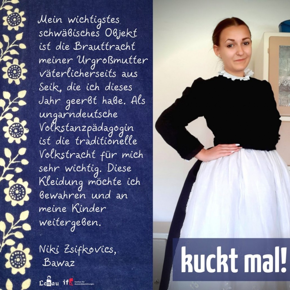 A legfontosabb sváb tárgyam a szajki apai dédnagymamám menyasszonyi népviselete, amelyet idén örököltem. Magyarországi német néptáncpedagógusként nagyon fontos számomra a hagyományos népviselet. Ezt a ruhát szeretném megőrizni és a gyerekeimnek továbbadni.