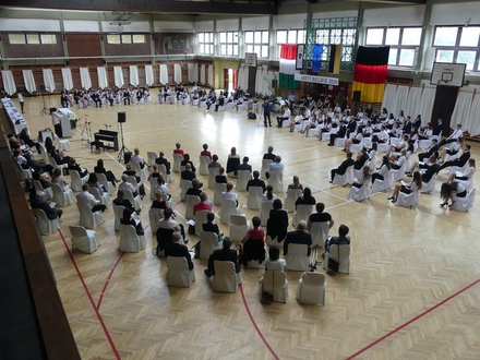 Az ünnepi beszédek sorát Johannes Schmid, Németországból érkezett pedagógus, az egyik végzős osztály osztályfőnöke zárta. Párhuzamot vont az iskola udvarán álló ulmi dereglye és az általa, a beszéd elmondása közben kézzel hajtogatott papírhajó között. Arra kérte a diákokat, legyenek nyitottak és bátran nézzenek szembe az új kihívásokkal!