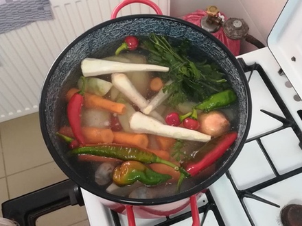 Hozzávalók: 2 kg tyúkhús (itt a megtöltött tyúk lett megfőzve), 100 g sárgarépa, 100 g petrezselyemgyökér, 1 hagyma, 4 gerezd fokhagyma, 1 paprika, 1 csokor petrezselyem zöldje, 10 szem feketebors, 1 db káposztatorzsa, víz, só, cérnametélt
