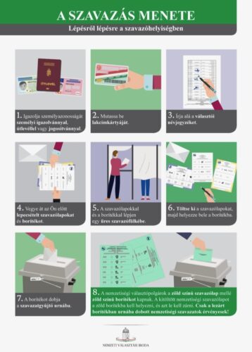 Az alábbi képet lépésről lépésre áttanulmányozva Ön is tudni fogja, hogy várhatóan mi történik majd a szavazóhelyiségben: hogy milyen dokumentumokat kell június 9-én bemutatnia, hogy mit kell aláírnia, kitöltenie, majd pedig, hogy mit, hol és hogyan kell elhelyeznie.