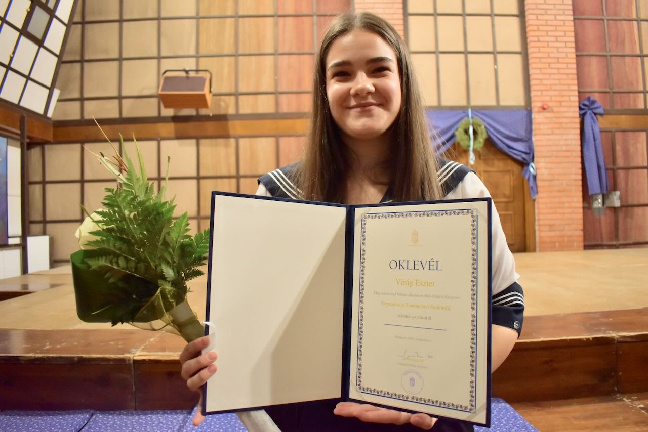 Az elmúlt évek gyakorlatát követve a Miniszterelnökség egyházi és nemzetiségi kapcsolatokért felelős államtitkársága idén is meghirdette pályázatát a nemzetiségi tanulmányi ösztöndíjra. A kiírás célja Magyarország valamely nemzetiségéhez tartozó, kiemelkedő képességű, a pályázat benyújtásakor 10. évfolyamos tanulók támogatása. Az államtitkárság az érettségi vizsgáig hátralévő két tanévben havonta ösztöndíjat folyósít a nyerteseknek. Nagy megtiszteltetés az MNÁMK közösségének, hogy tanulóink közül ketten – Virág Eszter és Kübler Zalán – is megfeleltek az elvárásoknak, és mostantól nemzetiségi ösztöndíjasként folytathatják tanulmányaikat.