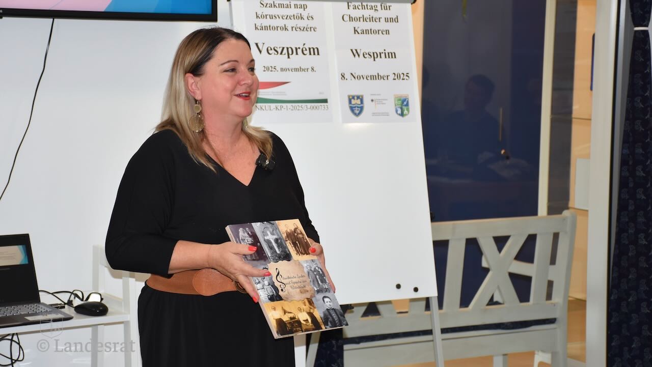 A képzés következő témájaként a német nemzetiségi népdalok lejegyzéséről és a dalok többszólamúságának variációiról tartott előadást Fazekasné Gombár Mónika, az ének szekció alelnöke. Kihangsúlyozta, hogy mekkora felelősségük van mindazoknak, akik egy közösséget szeretnének valamilyen irányba terelni, mint például a jelen levő kórusvezetőknek és kántoroknak. A Landesrat épp ebben partnerük, segíti őket abban, hogy hiteles forrásból származó dalokat, igényesen tudjanak betanítani a kórusaiknak. Ő is felhívta figyelmüket az értékmentésre, hogy örökítsék meg bármilyen módon is, akár rövid hangfelvételek formájában a még fellelhető helyi dallamokat, hogy a későbbiekben szakemberekhez eljuttatva, sor kerülhessen lekottázásukra, esetlegesen könyv formájában való kiadásukra. Majd a népdalok lejegyzésének módszerét részletezte, és bemutatta a Frühwirth Mihállyal közösen írt könyvét, a „Sváb énekek és mondókák Vecsésről” című kiadványt. Nagy a felelősség, viszont egyben hatalmas büszkeség is, ha bárkinek őseink kultúrájának egy szeletét sikerül nyomtatott formában is megörökítenie.
