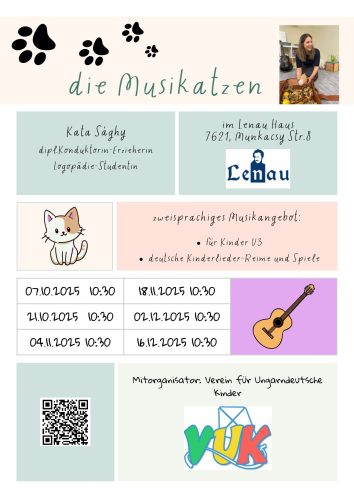 A Lenau Házban ingyenesen elérhetők német gyermekdalok, mondókák és kis mozgásos játékok – mindez kötetlen formában, kétnyelvűen Sághy Katával. A foglalkozások minden második kedden délelőtt zajlanak.