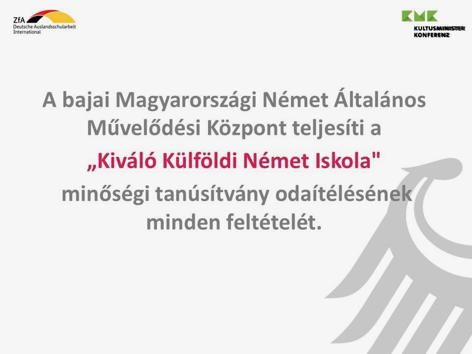 – Amennyiben egy intézmény megfelel a követelményeknek – ahogyan ez a mi iskolánk esetében történt –, minőségi tanúsítványt kap, és a következő években viselheti a „Kiváló Külföldi Német Iskola” kitüntető címet. A bajai intézmény már kettő alkalommal megszerezte a kitüntető címet, amit most harmadik alkalommal is kiérdemelt. A kecskeméti tagintézmény számára különleges volt ez az alkalom, hiszen ez volt az első ilyen ellenőrzés, és szintén megfelelt az elvárásoknak.